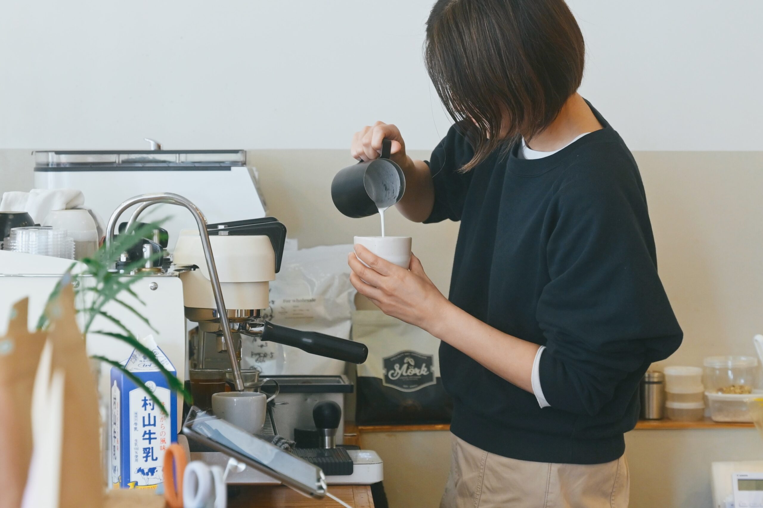 ピッチャーを傾けた瞬間、白いミルクがエスプレッソに、迷いなく落ちていく。
